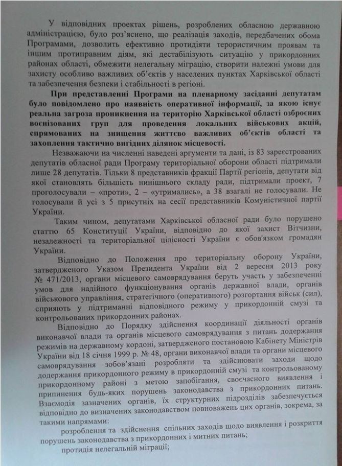«В связи с саботажем принятия Программ, направленных на повышение обороноспособности региона и защиту граждан от возможной агрессии, мною направляется представление в адрес Председателя Верховной Рады о необходимости досрочного прекращения полномочий Харьковского областного совета», - заявил Балута.