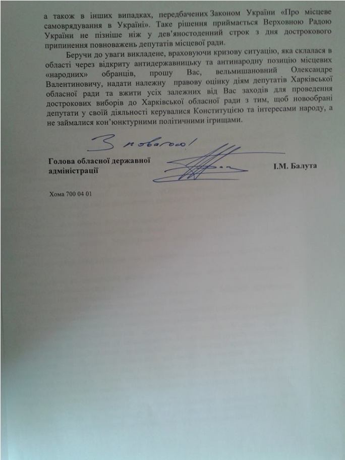 Председатель Харьковской областной государственной администрации Игорь Балута направил спикеру Верховной Рады Александру Турчинову представление о необходимости досрочного прекращения полномочий Харьковского облсовета. Об этом Балута сообщил на своей странице в «Фейсбуке».