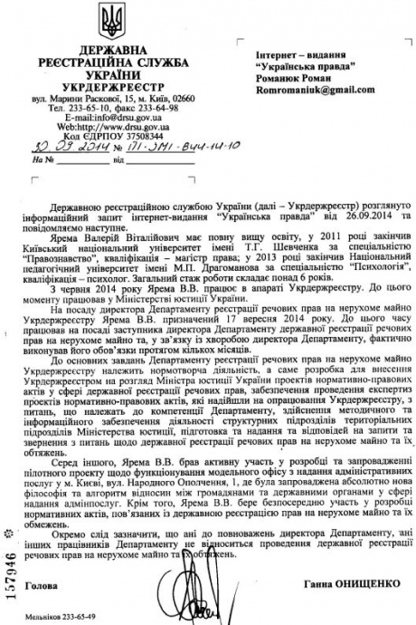 «С июня 2014 года Ярема В. В. работает в аппарате Укргосреестра. До этого момента работал в Министерстве юстиции. На должность директора Департамента регистрации имущественных прав на недвижимое имущество Ярема В. В. назначен 17 сентября 2014», - говорится в документе.