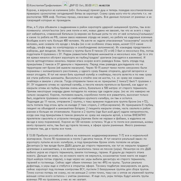 «Дальше не знаю, но из нового (терминала) никто не вернулся… А еще через час укры выбили десантуру из старого терминала, гаражей и гостиницы. Точно количество потерь не скажу, но не меньше 2 сотен точно», - говорится в сообщении на форуме.