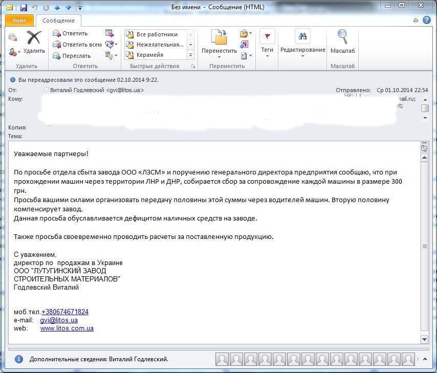Луганский завод строительных материалов (ЛЗСМ) обратился к дистрибуторам и поставщикам с просьбой обеспечить выплату сбора, в размере 300 грн, за сопровождение автомобилей с товаром, через территорию так называемых ДНР и ЛНР. Об этом говориться в письме директора по продажам ЛЗСМ Виталия Годлевского.