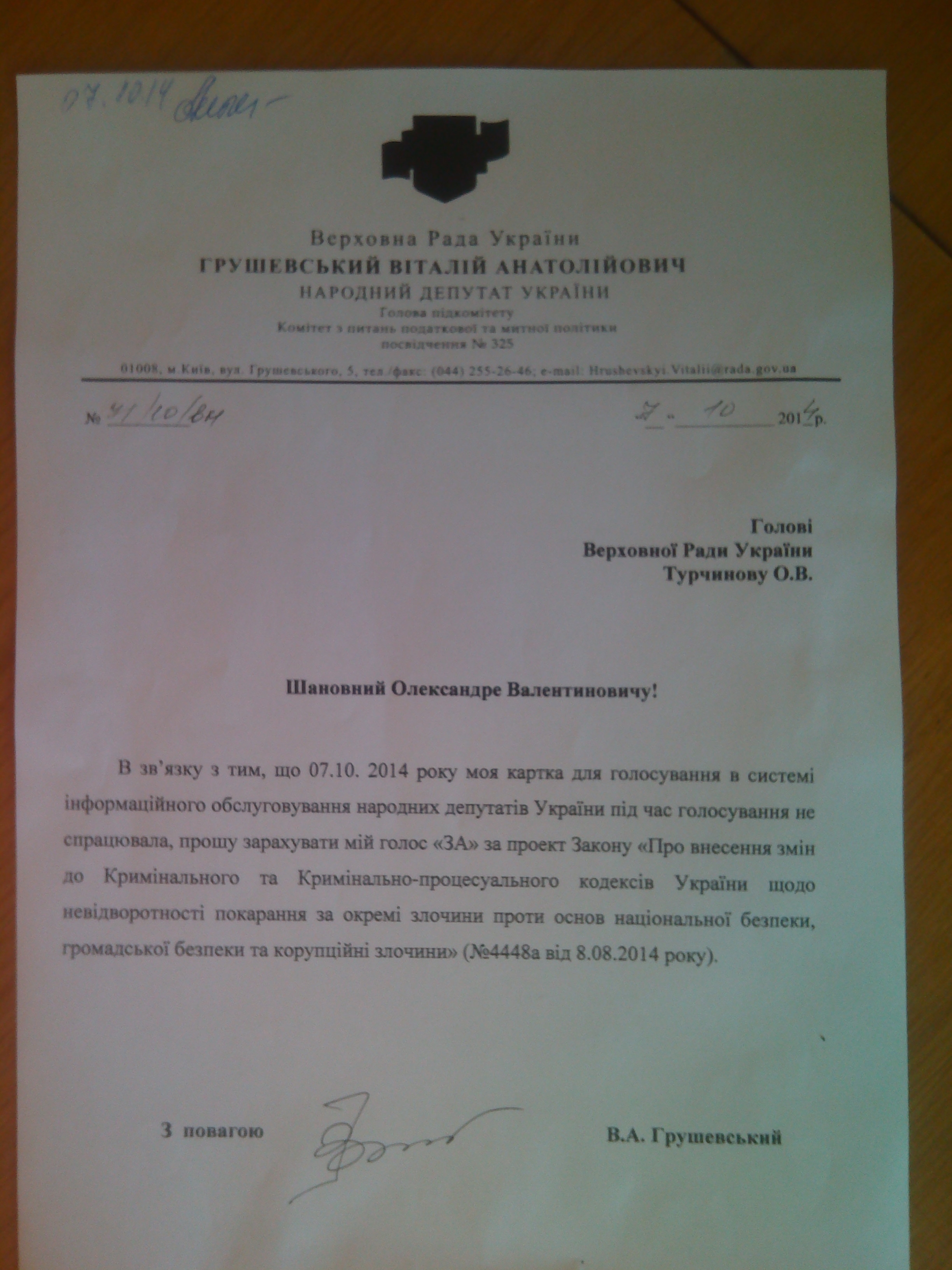 Сегодня Верховная Рада Украины приняла за основу и в целом законопроект №4448а «О проекте Закона о внесении изменений в Уголовный и Уголовный процессуальный кодексов Украины относительно неотвратимости наказания за отдельные преступления против основ национальной безопасности, общественной безопасности и коррупционные преступления». Среди тех парламентариев, кто проголосовал за этот закон, был и внефракционный народный депутат Виталий Грушевский.