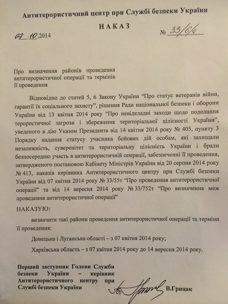 «Хочу отметить, что этот приказ никак не повлияет на предоставление статуса участника боевых действий лицам, которые защищали независимость, суверенитет и территориальную целостность Украины во время проведения операции», - добавил Лубкивский.