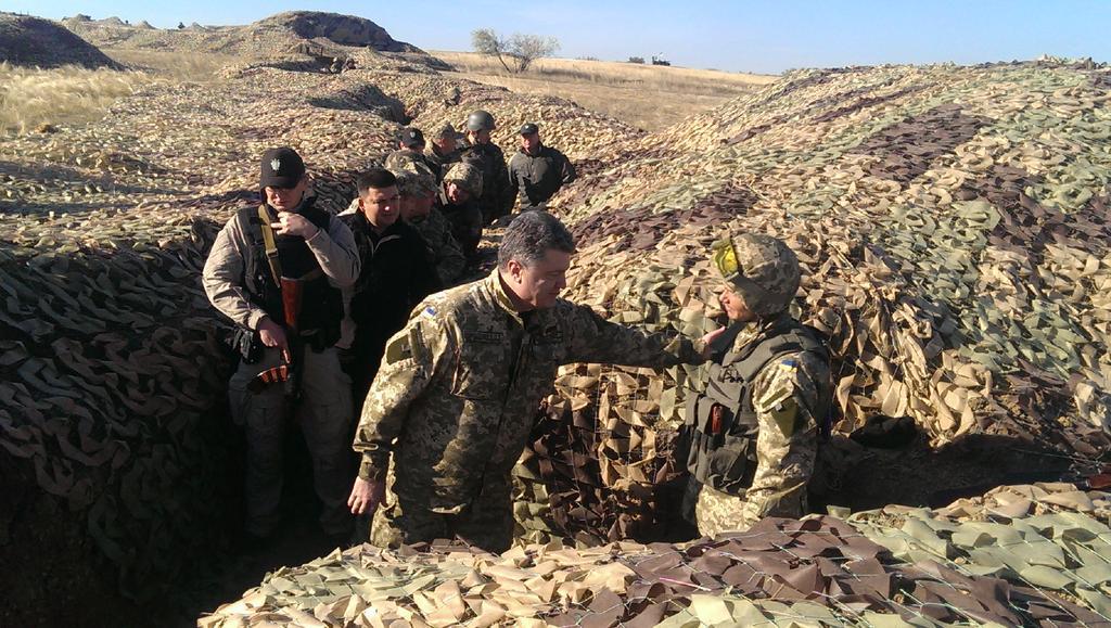 «Проинспектировал фортификационные укрепления украинской армии в 32 км от Донецка», - сообщил Порошенко.