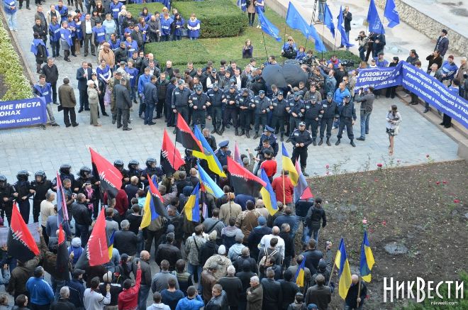 «Оппозиционный блок» и украинских активистов разделяет кордон милиции. Также правоохранители сосредоточены на границах площади перед зданием Николаевской областной государственной администрации.