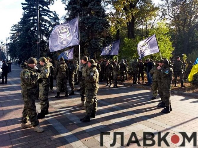 Также на площади Конституции находятся бойцы добровольческого батальона «Киев-1».