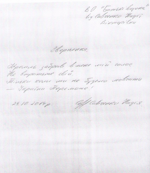 Первый номер избирательного списка партии «Батькивщина», украинская летчица Надежда Савченко передала из российской тюрьмы обращение к украинцам накануне выборов в парламент. Об этом сообщила лидер «Батькивщины» Юлия Тимошенко в эфире ТРК «Украина».