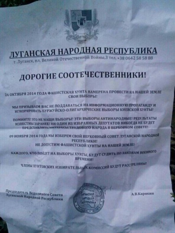 Согласно тексту листовки за подписью так называемого председателя «Верховного совета ЛНР» Карякина, жителей, которые примут участие в выборах, «будут судить по законам военного времени», а членов участковых и окружных избирательных комиссий - расстреляют.