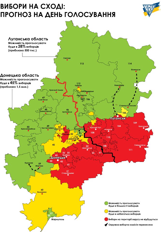 Комитет избирателей Украины представил карту округов в Донецкой и Луганской областях.На ней показано, где у избирателей будет возможность проголосовать, а где выборы не состоятся. Также указывается, какие окружные комиссии перенесены.