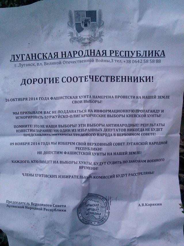 Боевики террористической организации «Луганская народная республика» угрожали тем, кто пойдет на выборы, «судом по законам военного времени», а членам избирательных комиссий - расстрелом.