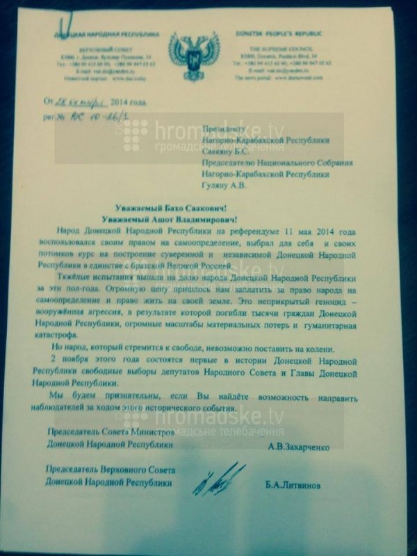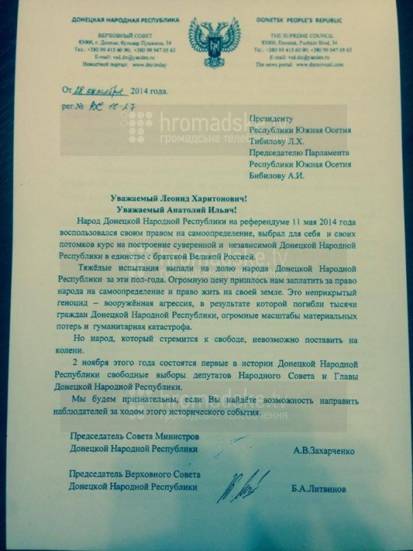 Так называемая «Донецкая Народная Республика» приглашает на незаконные выборы 2 ноября наблюдателей от непризнанных республик Южная Осетия и Нагорный Карабах.