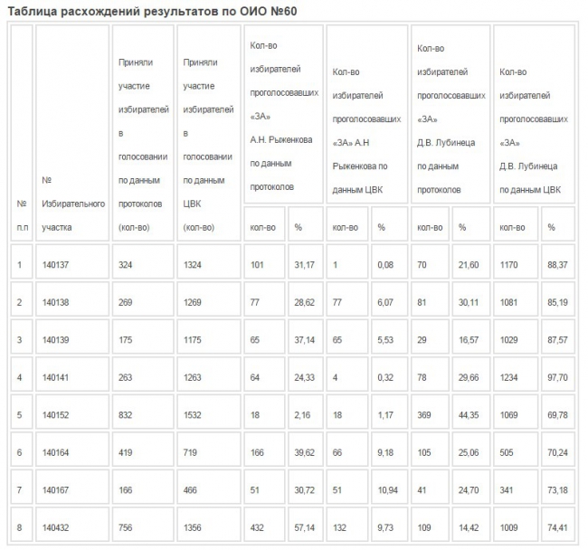 Согласно тексту замечаний к протоколу ОИК об итогах голосования в одномандатном избирательном округе №60 от 31.10.2014, в протоколе содержатся большие расхождения в цифрах с оригиналами протоколов участковых избирательных комиссий.