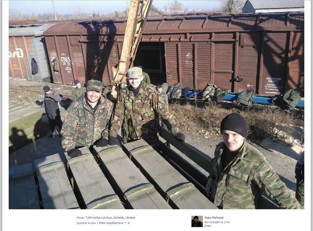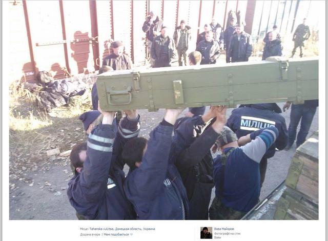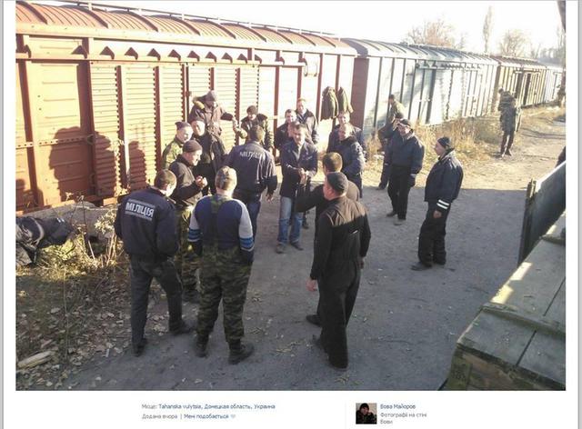 Он отмечает: «Сепар из Донецка засветил процесс выгрузки оружия из вагонов РЖД. Самое интересное, что бегают пособничают там террористам и бывшие менты, которые даже курточки МІЛІЦІЯ себе оставили».