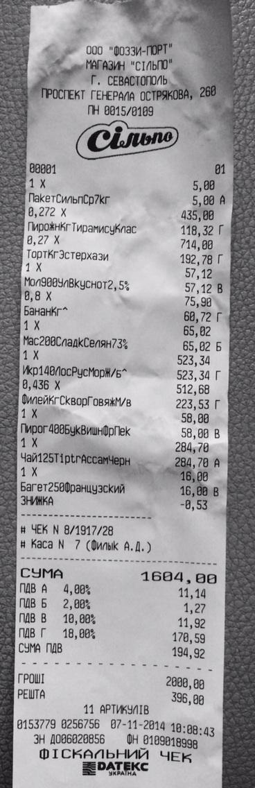 В сети появились фото чека из севастопольского супермаркета, согласно которому торт стоит 230 гривен.