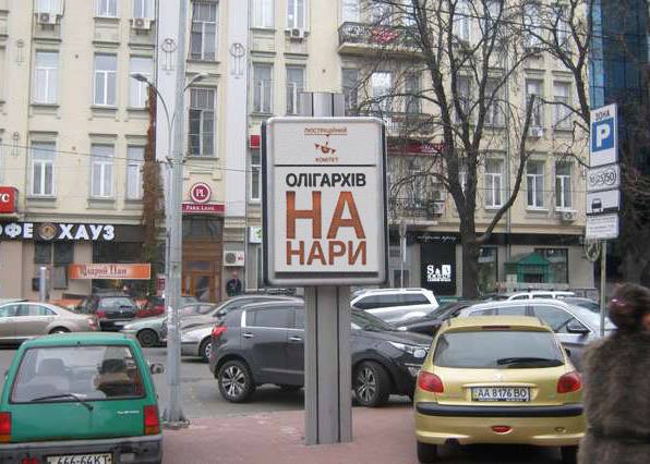 Сегодня утром активисты обклеили улицы возле бизнес-центра «Парус» (недалеко от Бессарабской площади) листовками и баннерами с текстом «Олігархів на нари». Об этом написал в «Фейсбуке» пользователь Рома Шупило.