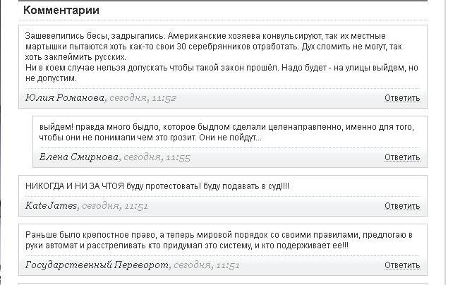 «Ни в коем случае нельзя допускать, чтобы такой закон прошел. Надо будет - на улицы выйдем, но не допустим»; «Никогда и ни за что, я буду протестовать! Буду подавать в суд!»; «Раньше было крепостное право, а теперь мировой порядок со своими правилами, предлагаю в руки автомат и расстреливать, кто придумал это систему, и кто поддерживает ее!»; «Сомнительно, что это делается для нашей безопасности. Я смотрю на жизнь реально».