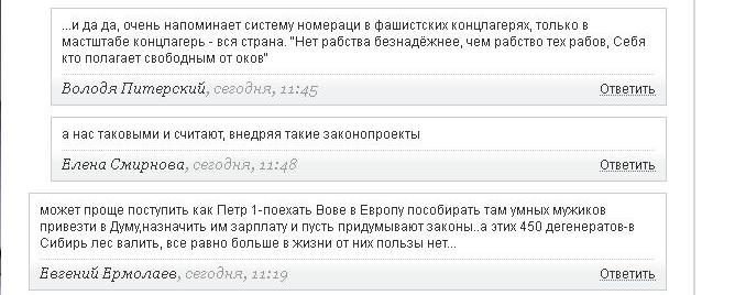 «Очень напоминает систему нумерации в фашистских концлагерях, только в масштабе концлагерь - вся страна»; «А чего не штрих-код наколоть??? Чудная практика Фашистской Германии... Больше проблем в стране нет. Лично я буду в этом случае подавать в суд за ущемление прав, а не поможет, буду уезжать всеми путями».