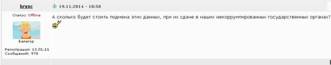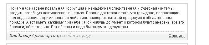 «А потом появятся базы с отпечатками в свободной продаже. Мы же знаем, как все продается в России»; «А вот как раз то и наоборот ...как телефонные базы гуляют так же будут гулять и эти базы ...и сделать твои пальчики на прозрачной ленте и наклеить на свои не проблема ...будут вешать на тебя чужие дела ....что ментов что ли не знаете наших?»; «Отвратительно. В нашей стране, имея такие сведения, можно подставить кого хочешь. Поэтому идут они лесом»; «Отпечатки пальцев еще куда не шло, а единая база геномной и биометрической информации совсем необязательна. Любую базу можно взломать»; «Пока у нас в стране повальная коррупция и ненадежная следственная и судебная системы, вводить всеобщую дактилоскопию нельзя. Вполне достаточно того, что граждане, попадающие под подозрение в криминальных действиях, подвергаются этой процедуре в обязательном порядке».