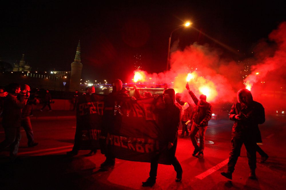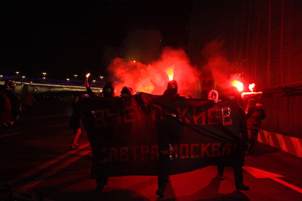 В центре Москвы активисты устроили акцию в поддержку Майдана. Они прошли по Софийской набережной и сожгли несколько файеров и флаг Новороссии. Активисты несли баннер с надписью «Вчера Киев — завтра Москва».