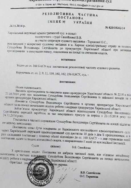 Своим решением суд обязал немедленно восстановить Суходубова в должности начальника отдела по работе с кадрами прокуратуры Харьковской области.