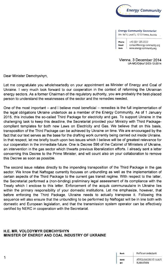"Позвольте мне указать два вопроса, которые будут иметь наибольшее значение для нашего сотрудничества в будущем. Один из них - это Постановление № 596 Кабинета Министров Украины, которое допускает вмешательство государства в газовый сектор и подрывает усилия по либерализации рынка", - говорится в письме главы Секретариата Европейского Энергетического Сообщества Янеша Копача на имя Владимира Демчишина.