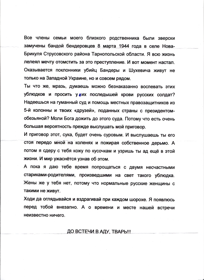 «Я вынул из почтового ящика конверт без обратного адреса с письмом, где аноним недвусмысленно предупреждает о вынесенном им мне смертном приговоре. Сверхагрессивная истерия вокруг украинских событий, накручиваемая безбашенными центральными нашими СМИ и некоторое количество отморозков из гиркинско-стрелковских «добровольцев»- головорезов, успевших испытать вкус крови на Донбассе, дают мне все основания вполне серьезно отнестись к этим угрозам», - сообщил он «Главкому».
