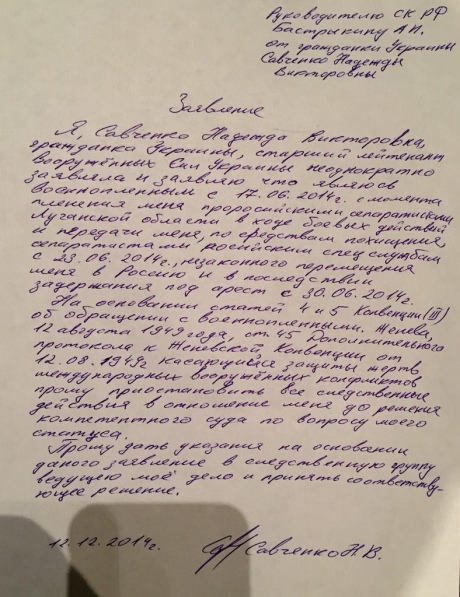 Савченко просит остановить дело против нее и думает о голодовке (ДОКУМЕНТ)