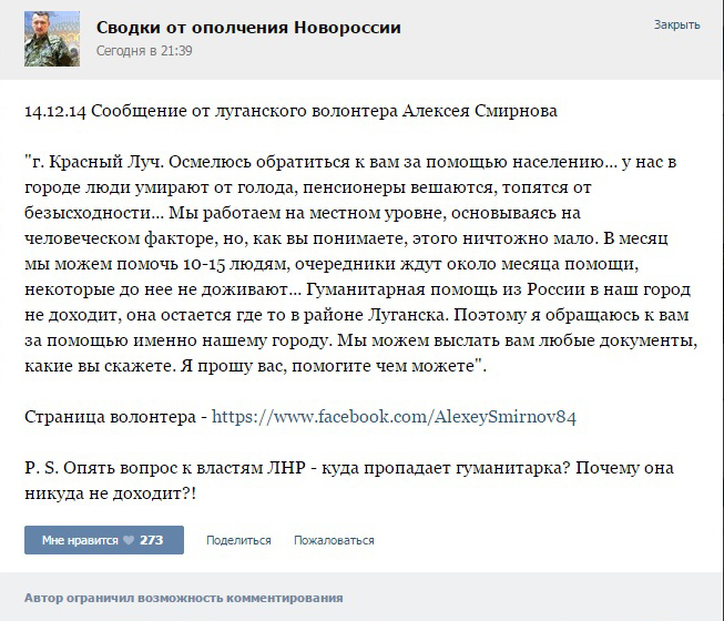 Со слов «волонтера» Алексея Смирнова, жители города голодают и есть случаи суицида, в то время как помощь из России оседает в Луганске.