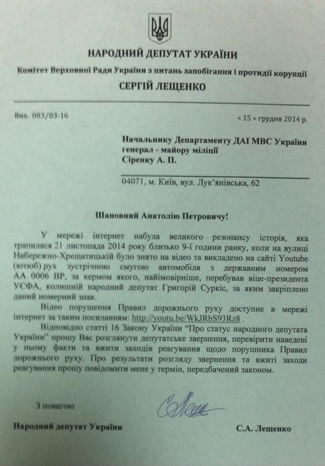 Лещенко направил соответствующее обращение начальнику Департамента ГАИ МВД Украины Анатолий Сиренко с просьбой принять меры по Григория Суркиса.