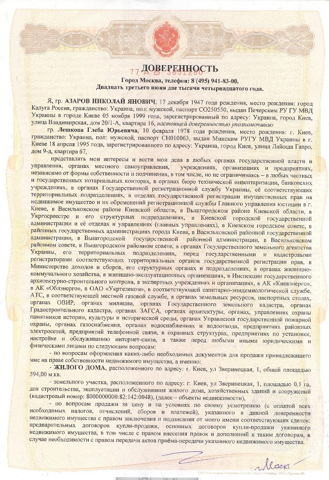 Эту доверенность Азаров оформил у московского нотариуса 23 июня этого года. Согласно документу интересы Азарова относительно продажи имущества будет представлять Глеб Лешков, который занимал руководящие должности в компаниях из строительной группы «Развитие» Алексея Азарова, сына экс-премьера.
