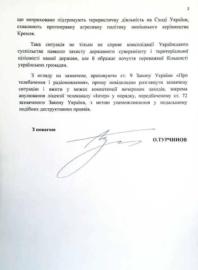 Секретарь Совета национальной безопасности и обороны Александр Турчинов направил руководителю Совещания по вопросам телевидения и радиовещания письмо с требованием аннулировать лицензию на вещание телеканала «Интер».