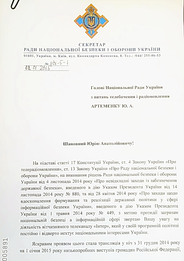 «Обращаю Ваше внимание на деятельность отечественного телеканала «Интер», который в своей программной политике постоянно и откровенно пренебрегает интересами Украины. Ярким примером этого стала трансляция в ночь с 31 декабря 2014 года на 1 января 2015 года низкопробных выступлений граждан Российской Федерации, которые открыто поддерживают террористическую деятельность на востоке Украины, одобряют противоправную агрессивную политику нынешнего руководства Кремля», - говорится в письме Турчинова, обнародованном на сайте СНБО.