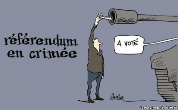 Один из рисунков карикатуристов показывает весь смысл «референдума» и аннексии полуострова. Пользователи социальных сетей среди карикатур французского сатирического журнала Charlie Hebdo, редакцию которого расстреляли, нашли также работы на тему так называемого «референдума», который проходил в марте 2014 года в Крыму, и на тему действий президента России Владимира Путина в Украине.