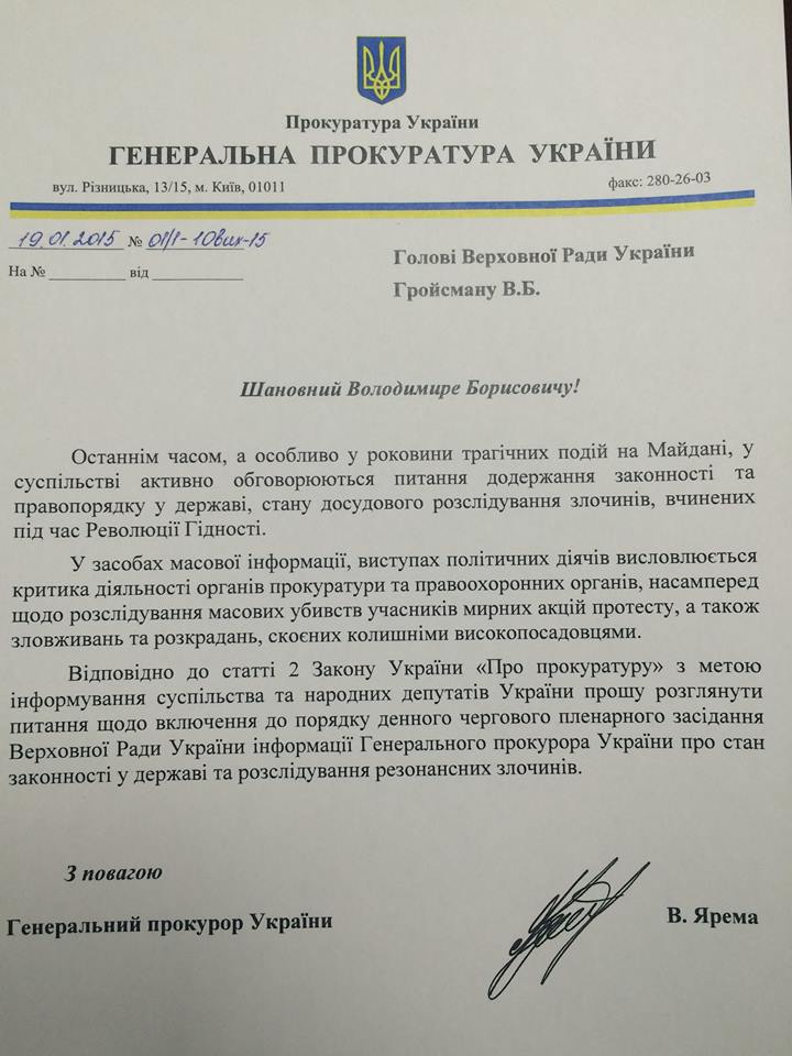 Генеральный прокурор Украины Виталий Ярема обратился к председателю Верховной Рады Владимиру Гройсману с просьбой включить в повестку дня заслушивание информации о состоянии законности в государстве и расследований резонансных преступлений.
