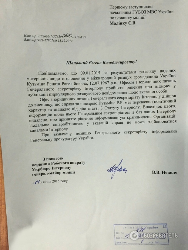 Интерпол отказался объявлять в международный розыск бывшего первого заместителя генерального прокурора Украины Рената Кузьмина. Об этом говорится в письме руководителя рабочего аппарата Укрбюро Интерпола Василия Неволи, адресованном первому заместителю руководителя ГУБОП Евгению Малинко.