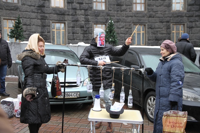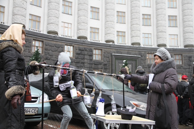 Возле здания Кабинета министров Украины в среду, 21 января, актеры театра уличной сатиры разыграли перфоманс против приватизации стратегических предприятий Украины под названием «Вторая спиртовая симфония Яценюка».
