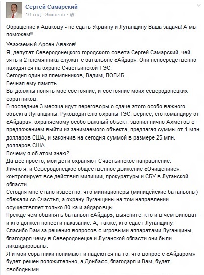 "Уважаемый Арсен Аваков! ...Вы должны понять мое состояние, и состояние моих северодонецких соратников... Сегодня мне стало известно, что милиционеры (милицейские батальоны) сбежали из Счастья, а охрану Луганщины на том направлении осуществляет только 80-ка и айдаровцы. Прежде чем обвинять батальон "Айдар", выясните, кто и в чем виноват и кто должен понести наказание. А, также, кто сдает Луганщину...", написал депутат.