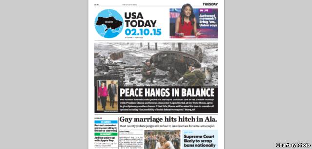 Отображение Украины без Крыма, размещено на первой странице газеты за 10 февраля 2015 года.