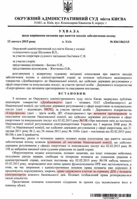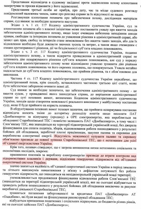 Это произошло после решения Окружного админсуда Киева, принятого в этот же день. Столичный суд приостановил распространение на "Донбассэнерго" запрета по платежам в зону АТО, после чего ГП "Энергорынок" перечислило 199 млн 900 тыс. гривень на счет "Донбассэнерго".