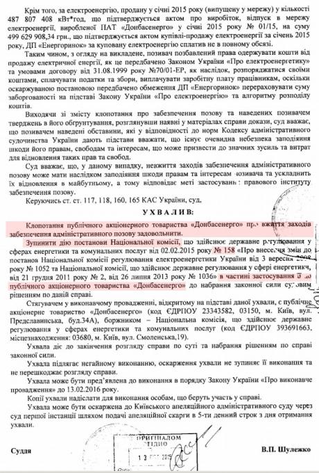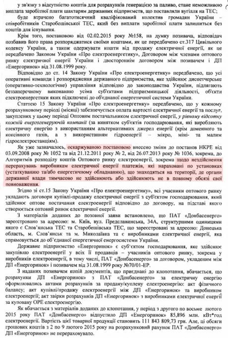"2 февраля 2015 новый руководитель Нацкомиссии регулирования электроэнергетики Дмитрий Вовк подписал постановление N158, которым запретил осуществлять платежи за электроэнергию, произведенную на мощностях оккупированных территорий Донбасса.... На следующий день Янукович-младший пошел в Окружной административный суд Киева с жалобой на действия Волка", - отметил Лещенко.