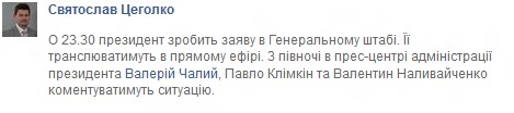 С полуночи в пресс-центре Администрации Президента (АП) будут находиться замглавы АП Валерий Чалый, Министр иностранных дел Павел Климкин, а также глава СБУ Валентин Наливайченко, которые будут коммментировать ситуацию с начала предполагаемого перемирия.