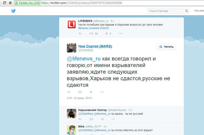Заявление о том, что теракты в Харькове продолжатся, разместил в Твиттере гражданин Беларуси, сторонник российских взглядов Сергей Чиж.