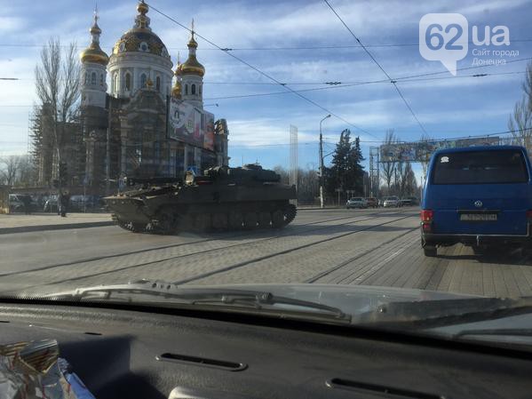 В среду, 25 февраля, утром в Донецке на перекрестке ул. Куйбышева и Ленинского проспекта было застопорено движение из-за проезда пяти самоходных артиллерийских установок.