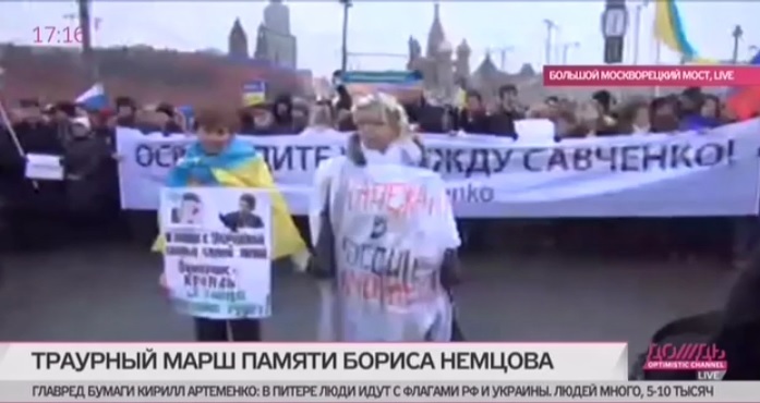 Среди людей, принимающих участие в марше памяти Бориса Немцова проходит колонна граждан в том числе с флагами Украины. Люди держат плакаты с требованием освободить украинского военнопленного Надежду Савченко, которая 79 голодает, находясь в заключении в российской столице.