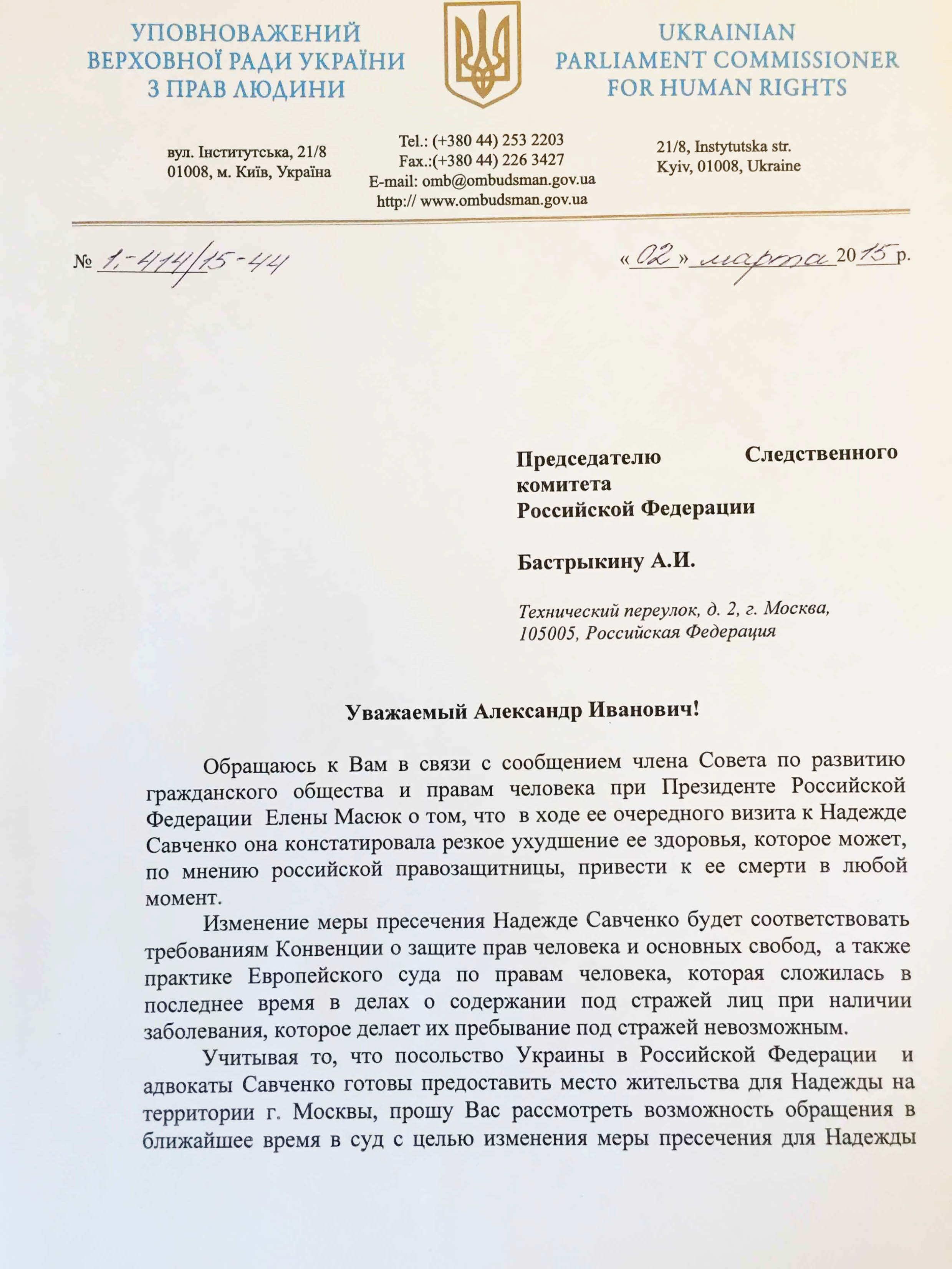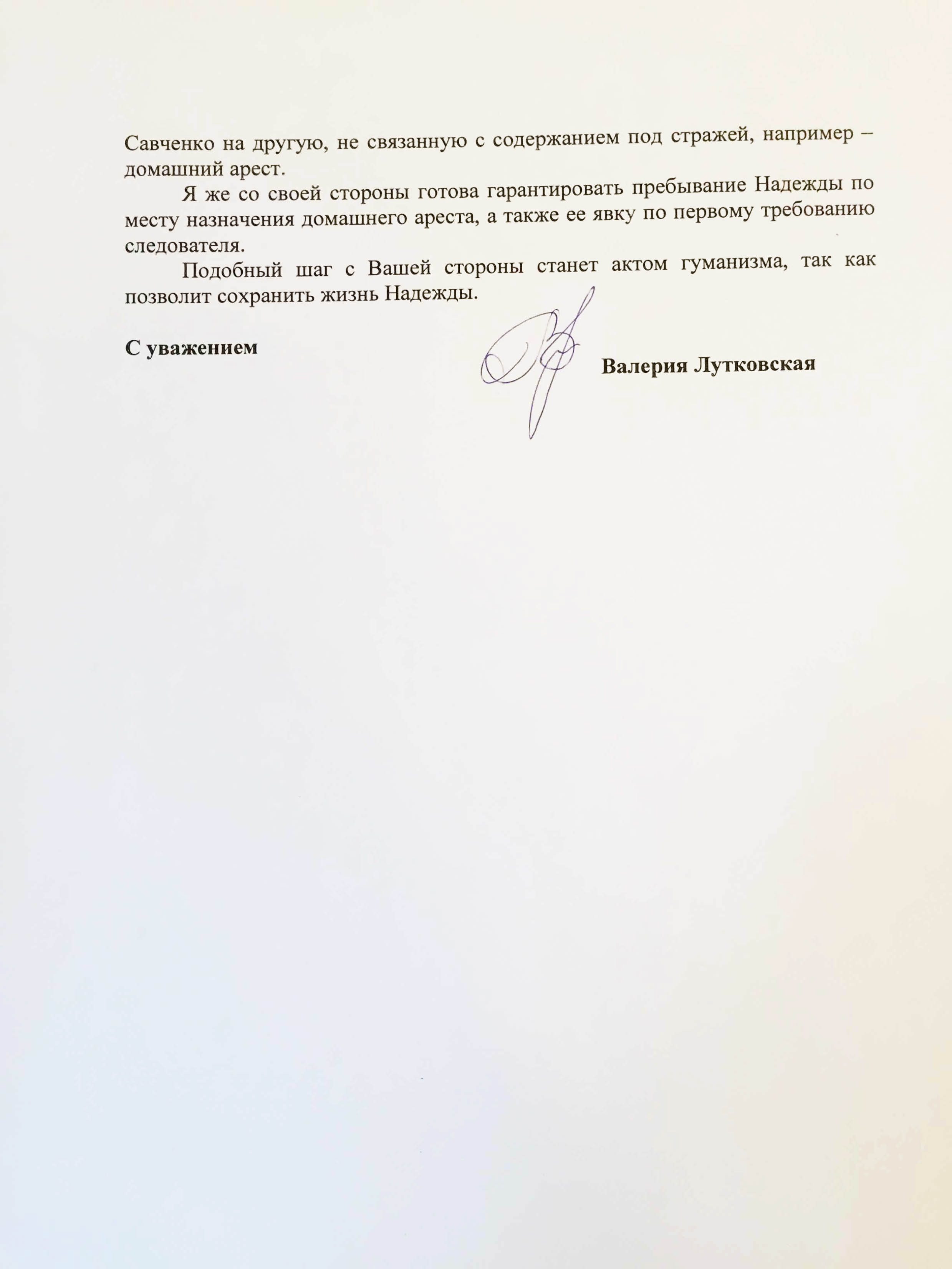 «Учитывая то, что Посольство Украины в Российской Федерации и адвокаты Надежды Савченко готовы предоставить место проживания для нее на территории г. Москвы, прошу Вас рассмотреть возможность обращения в ближайшее время в суд с целью изменения меры пресечения для Надежды Савченко на другую, не связанную с содержанием под стражей, например - домашний арест», - говорится в письме Лутковской.