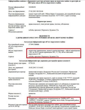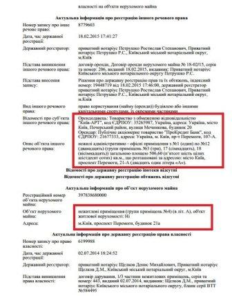 «В частности, в 2012-м фирма Пелых «Киев-Арт» купила «с молотка» 352 кв. м. на проспекте Победы, 21А. Там несколько групп помещений (по адресам проспект Победы, 21а, и проспект Победы, 21а, буква "А") граничат друг с другом».