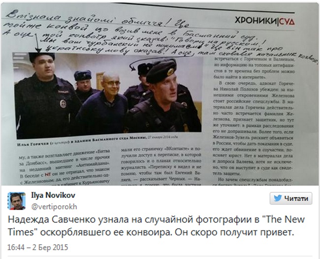 «Надежда Савченко узнала на случайной фотографии в «The New Times» оскорблявшего ее конвоира. Он скоро получит привет», - сообщил Новиков.