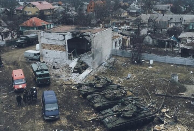 «Так, во дворе ближайшей к аэропорту девятиэтажки, точнее того, что от нее осталось, расположились три танка», - пишет агентство.