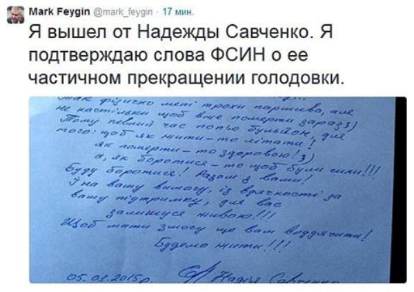 Фейгин также обнародовал письмо Савченко, в котором она объясняет свое решение о частичном прекращении голодовки.