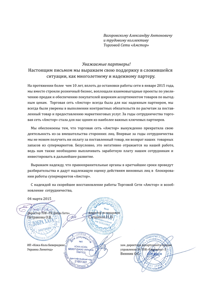 Документ, датированный 4 марта 2015 года, подписали представители компаний "Кока-кола бевериджис Украина Лимитед", "Евромикс", "Добра хата" и другие.